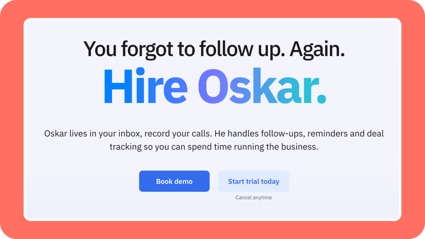 Skarbe uses Oskar, an AI assistant living in your inbox, to record calls, manage follow-ups, and send reminders.