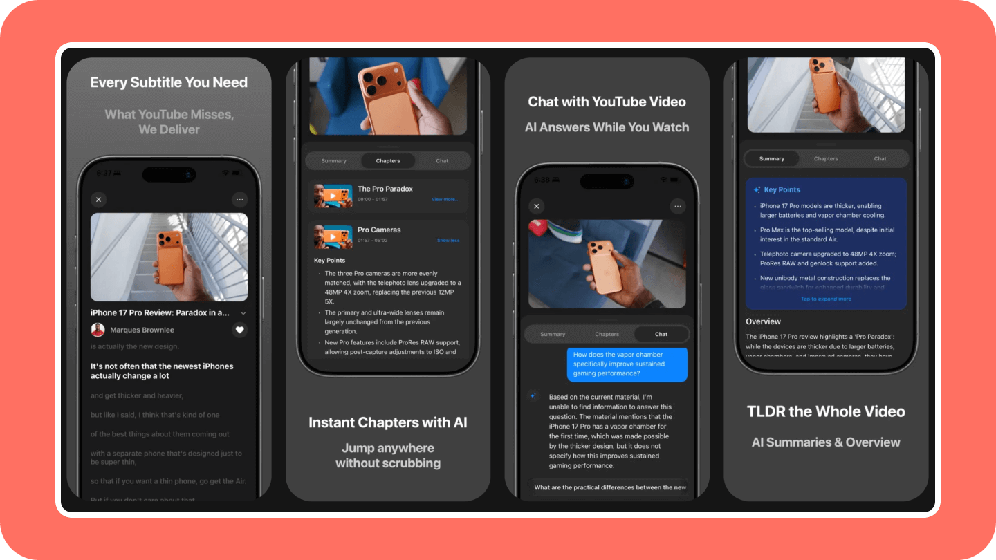 The tool summarises content, creates chapters, transcripts, and translations, and provides a chat interface to answer your questions.