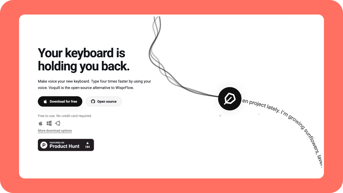 Voquill is a voice‑first keyboard turning speech into clean text on any desktop app.