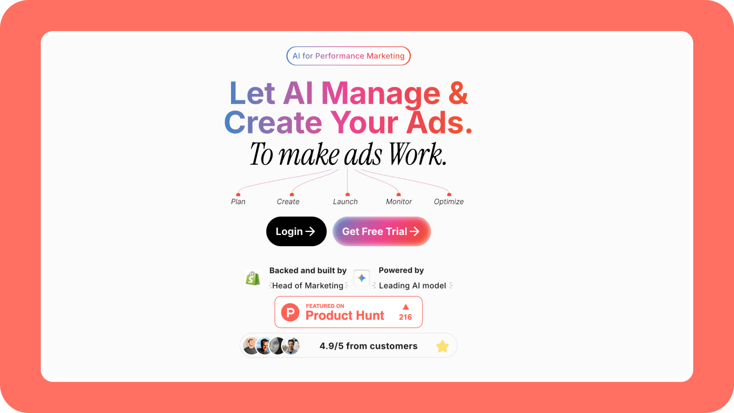 The AI analyses your site, generates image and video ads, deploys them to Meta and Google, and adjusts bids and budgets around the clock.