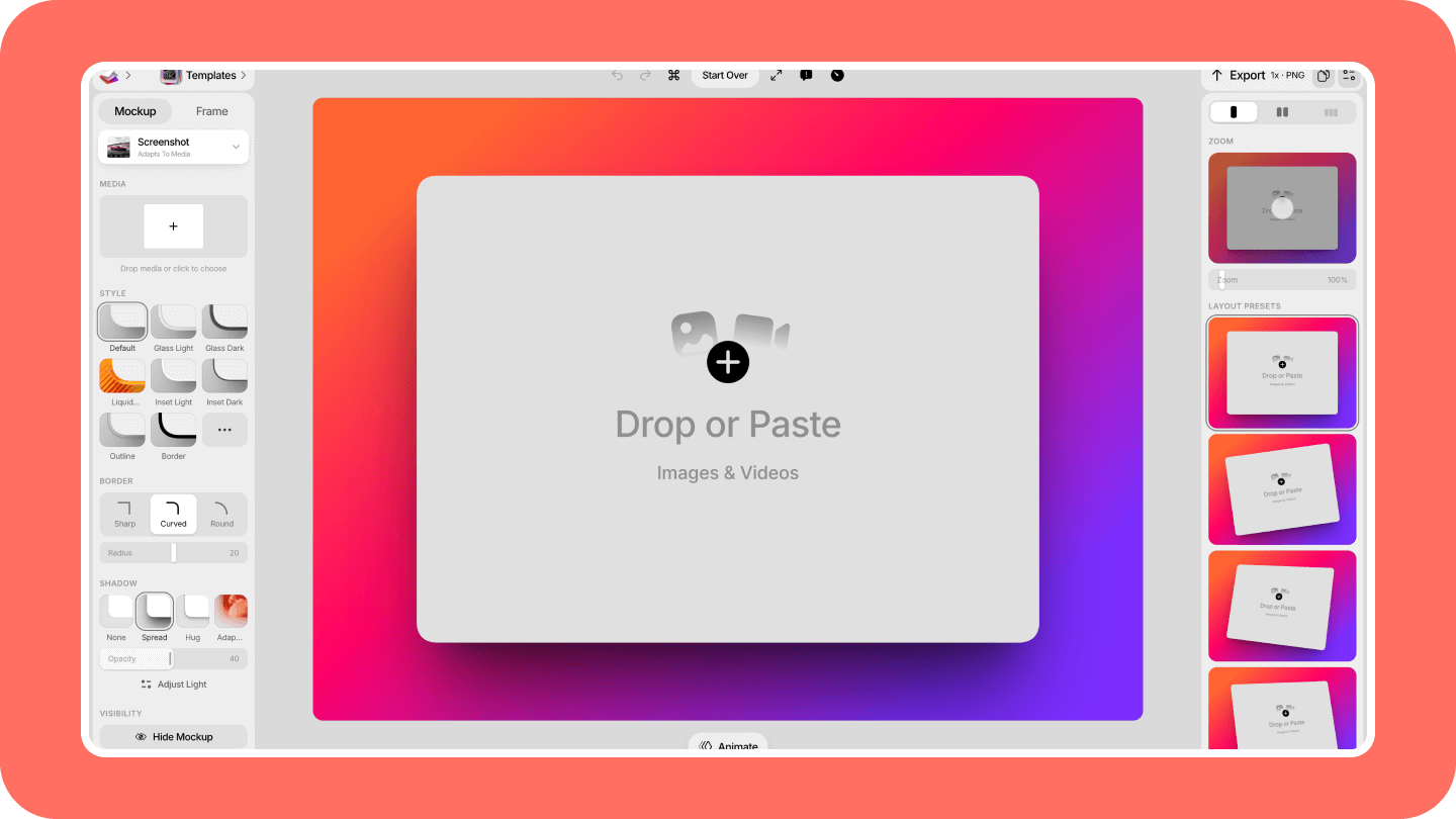 Users drop in their screenshots, apply zoom and animation presets, choose backgrounds, filters, and 3D shapes, then export in the right format.