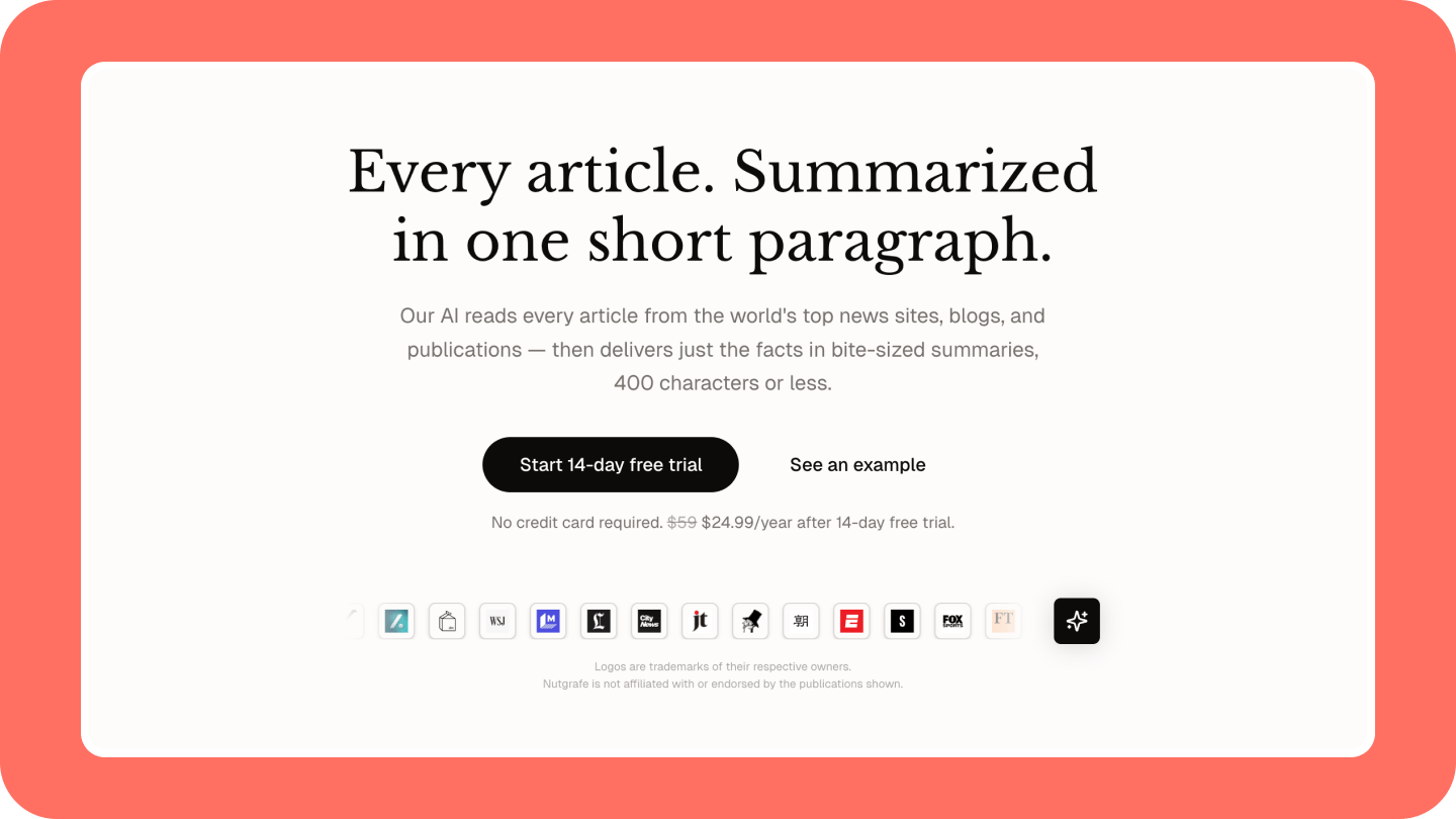 Nutgrafe reads articles from top news sites, blogs, and publications, then condenses each into a 400‑character summary.